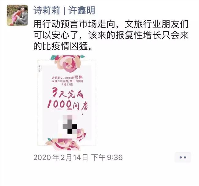 對負面消息最好的回應便是業績。 2 月 14 日下午,許鑫明曬出了詩莉莉的階段性成果: 3 天 1000 間房。